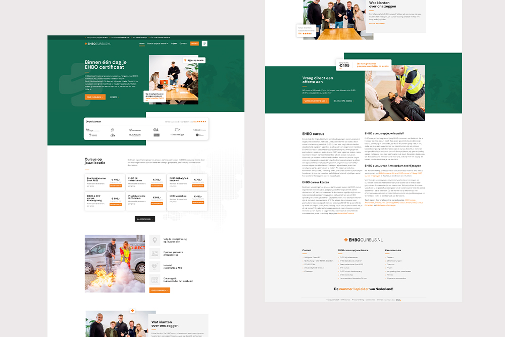 Voor EHBO Cursus is een volledig nieuwe branding ontwikkeld, inclusief een strak logo, een complete huisstijl en een bijpassende website. Het logo combineert de kleuren rood en oranje, terwijl de website een contrasterend groen gebruikt om belangrijke elementen goed te laten opvallen. Het resultaat is een professioneel en overzichtelijk design dat direct herkenbaar is en de betrouwbaarheid van de cursus benadrukt.