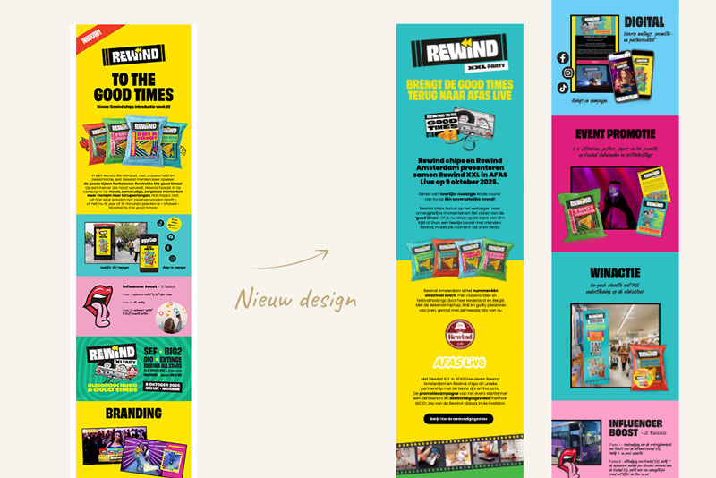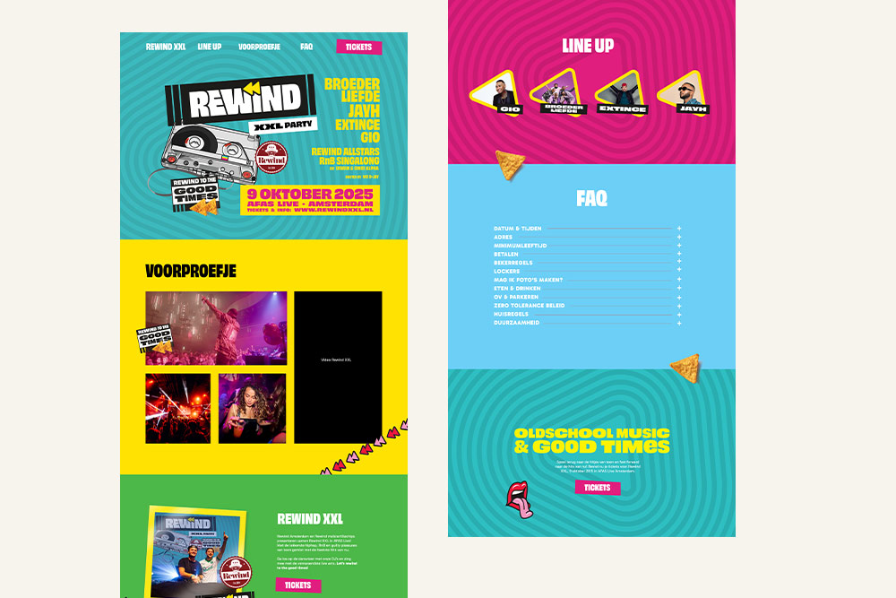 Voor het evenement Rewind XXL in AFAS Live een samenwerking tussen Rewind Amsterdam en Rewind Maïstortillachips heb ik de volledige website ontworpen én gerealiseerd. Het event staat bekend om de lekkerste hiphop, R&B en guilty pleasures van toen, gecombineerd met de heetste hits van nu.