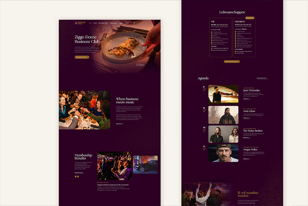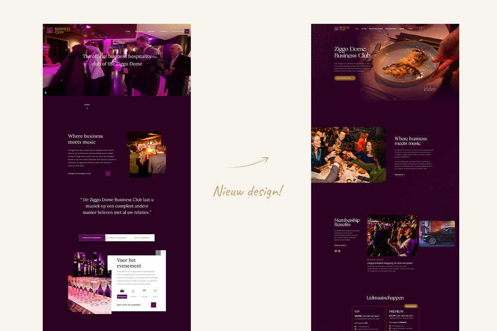 Voor dit project is de bestaande website volledig opnieuw ontworpen. De wens was om de opvallende paarse kleur minder dominant te maken en de uitstraling professioneler en exclusiever te laten ogen. Het resultaat is een fris, strak en modern design dat beter past bij de premium uitstraling van de Ziggo Dome Business Club.